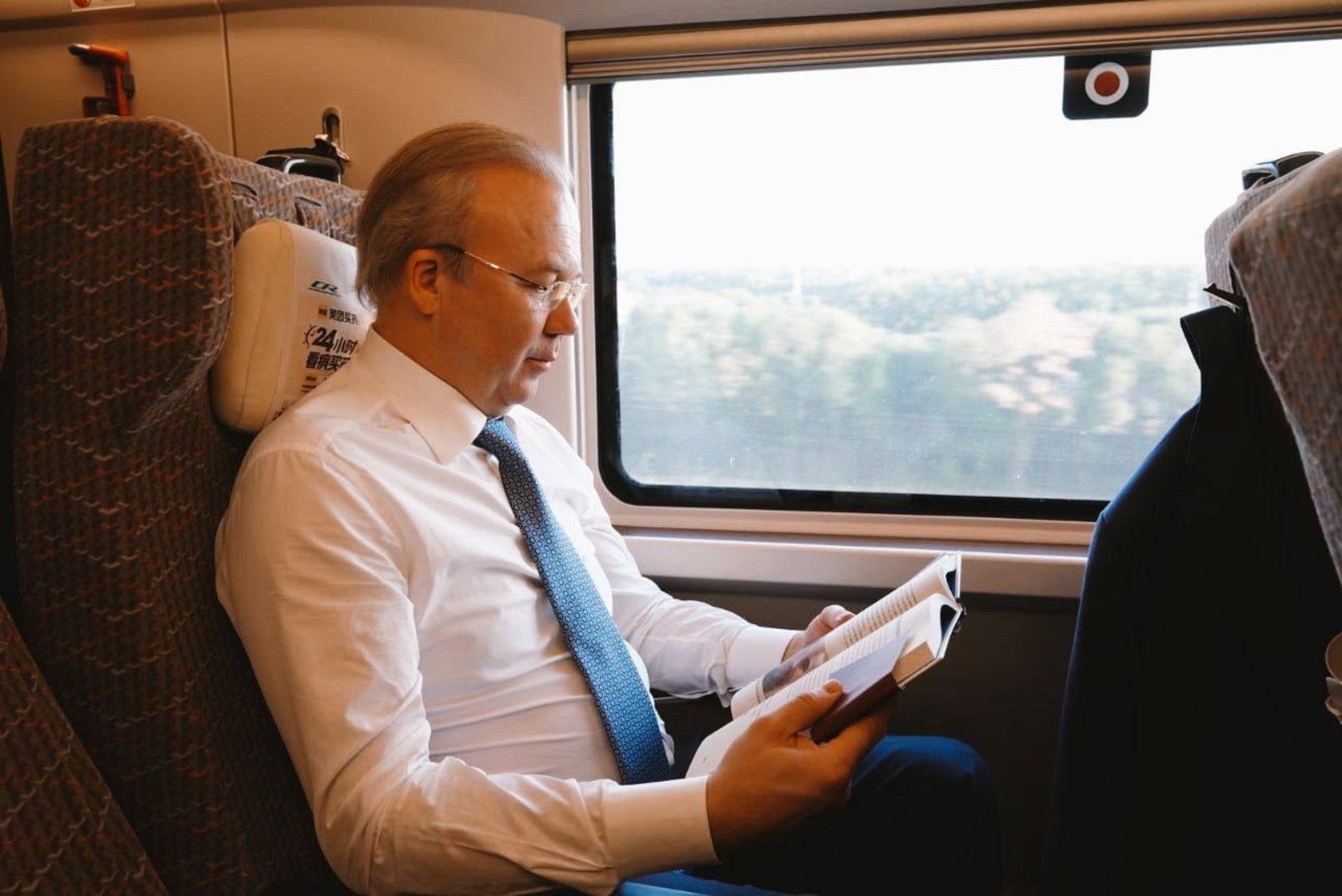 «В пути 3 часа. Есть время обсудить с нашим представителем при Торговом представительстве России в Китае Флюром Асадуллиным рабочие моменты. Еще успел немного перевести дух за чтением книги. Концентрация и силы понадобятся всем коллегам. Впереди – плотный график деловых встреч в режиме нон-стоп», - написал Андрей Назаров.
