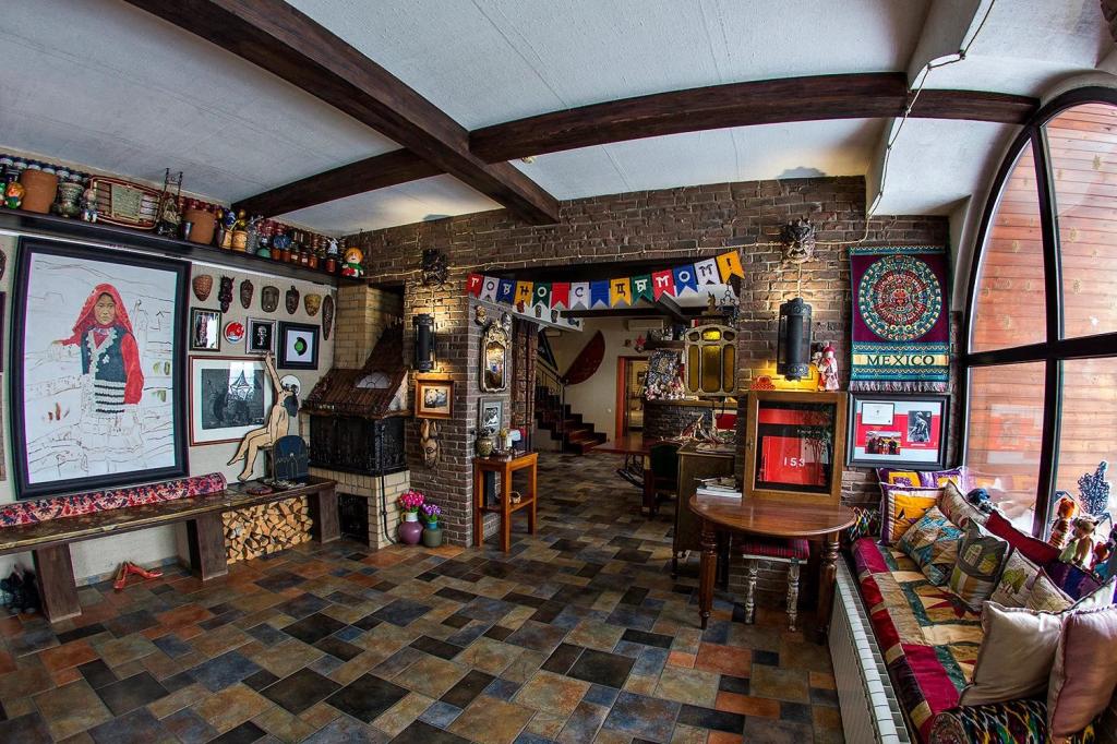 На кухне можно погреться у настоящего камина. А люстра — это старое колесо от телеги. Хозяин дома угостит чаем или кофе за большим столом и с радостью расскажет о вещах, которые вас окружают.