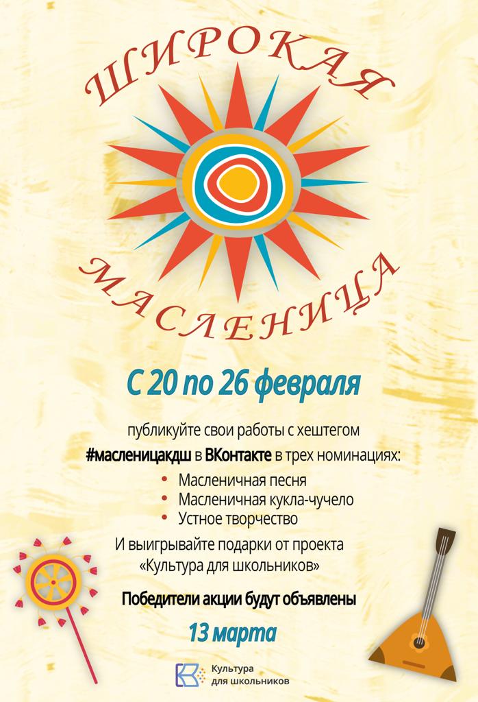 С 20 по 26 февраля состоится Всероссийская акция «Широкая Масленица», направленная на популяризацию традиционной культуры народов России и активного формирования эстетического вкуса у школьников на основе народной культуры.