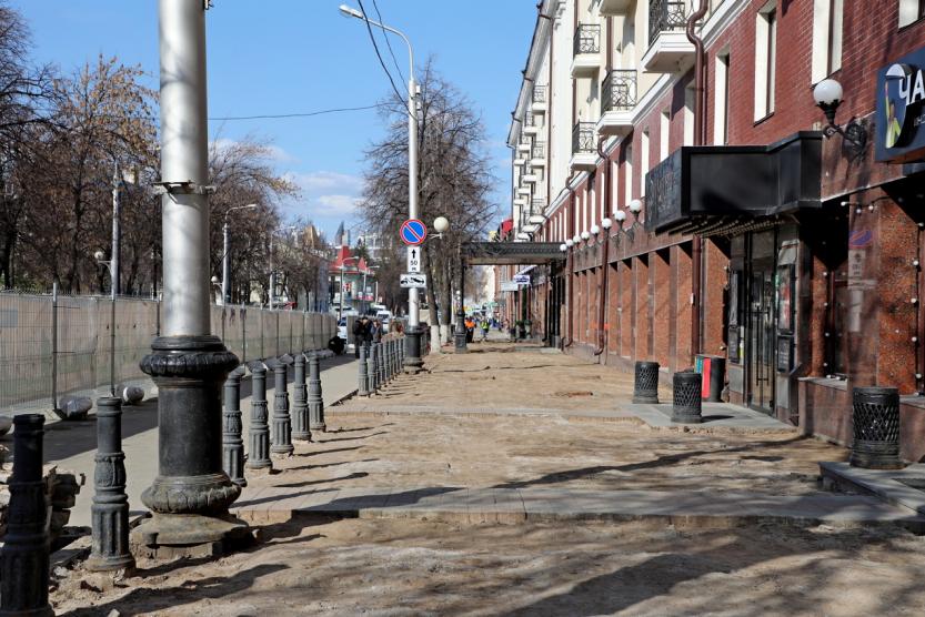 Продолжается ремонт тротуаров на ул. Ленина – от ул. Пушкина до Кирова. Это мощение из гранита, озеленение, устройство антикарманов, велодорожек, установка опор освещения. Реализуется проект «Чистое небо». Такие же работы запланированы на участке ул. Пушкина – от ул. Ленина до Карла Маркса.