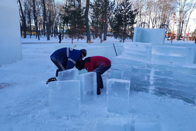 Прозрачный природный материал уже доставляют на территорию парка. Строители приступили к распилу и установке льда. Совсем скоро присоединятся к оформлению и ледовые скульпторы.