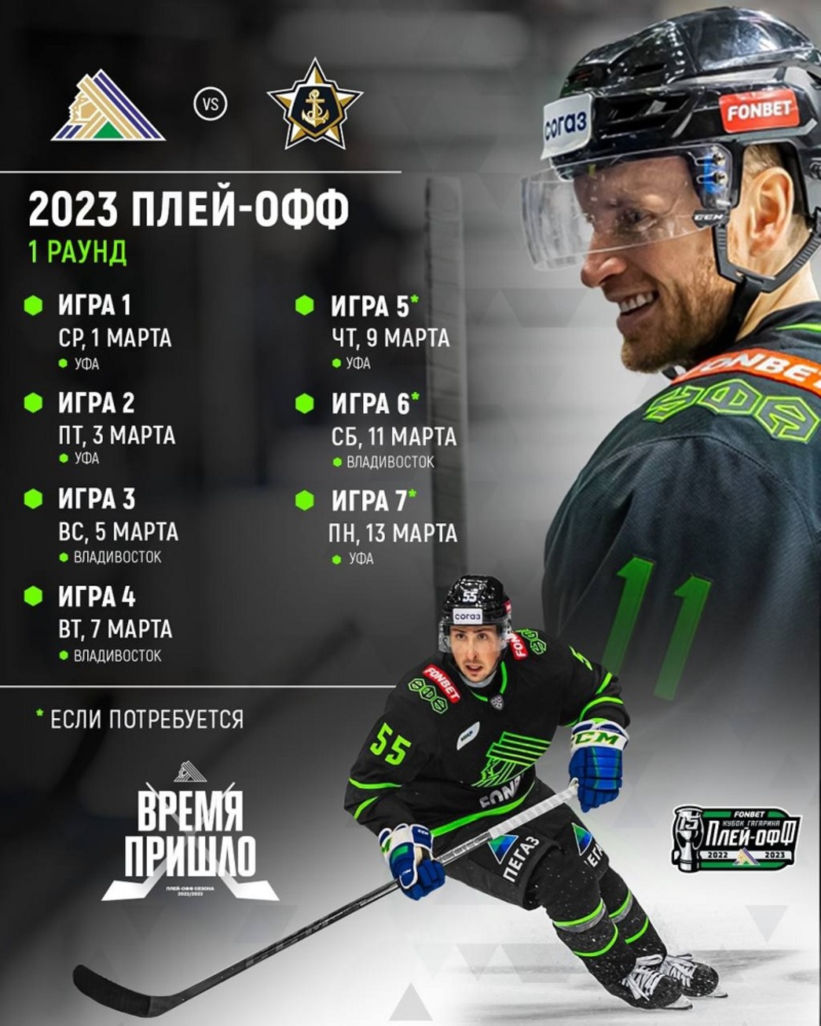 «Салават Юлаев» (2) — «Адмирал» (7) — 1, 3, 5, 7, 9*, 11*, 13* марта;