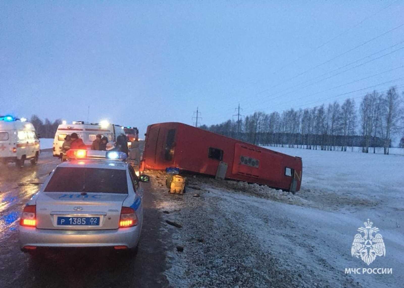 В пяти километрах от башкирского города Янаул на автодороге регионального значения «Янаул – Уфа» в кювет съехал и опрокинулся рейсовый пассажирский автобус «Скания». Автобус следовал в Уфу, он принадлежит «Башавтотрансу».