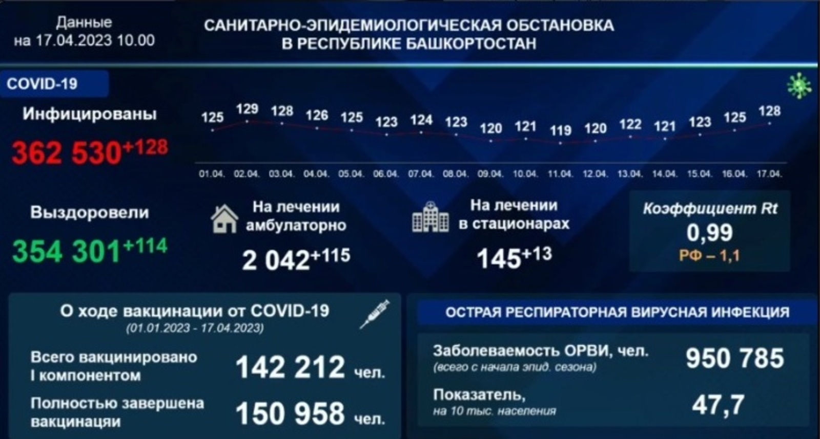 Только за последние сутки коронавирусом заболели 128 человек. 13 человек госпитализированы, а всего на лечении в стационарах находятся 145 жителей Башкирии.