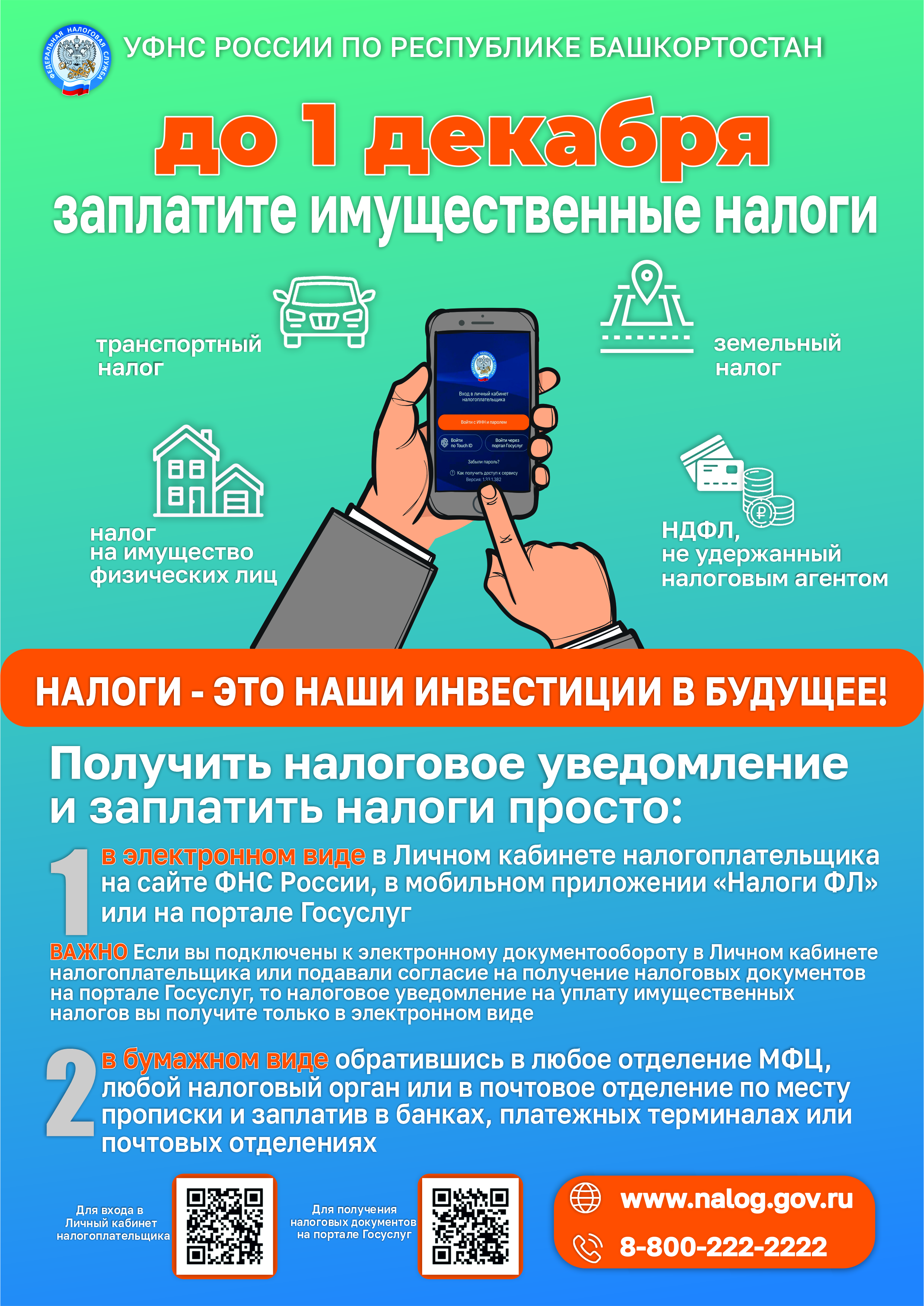Остались вопросы? Обратитесь в контакт-центр ФНС России 8-800-222-2222 или на «Горячую линию» УФЕС России по Республике Башкортостан 8 (347) 215-10-70 (доб.55-55).
